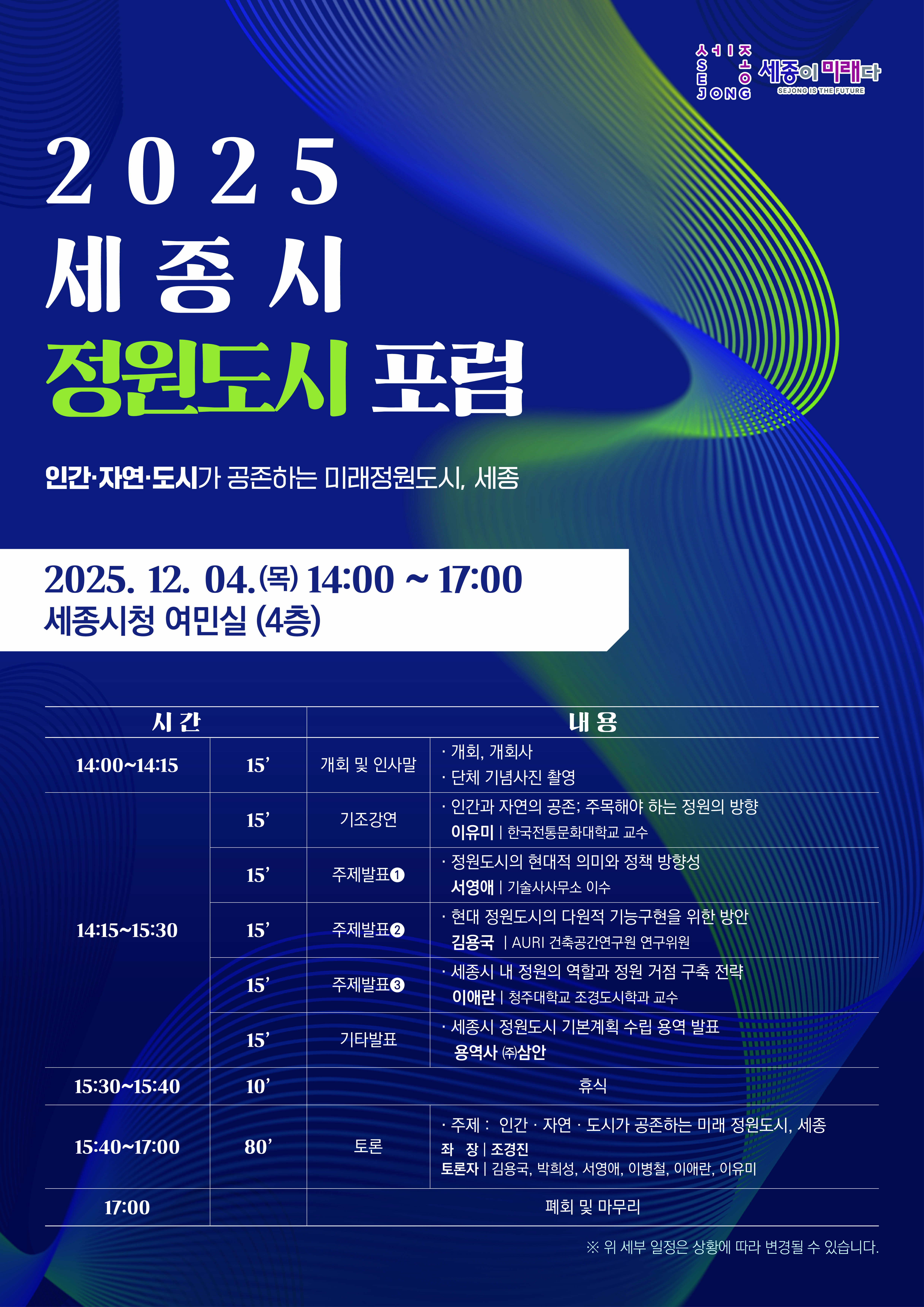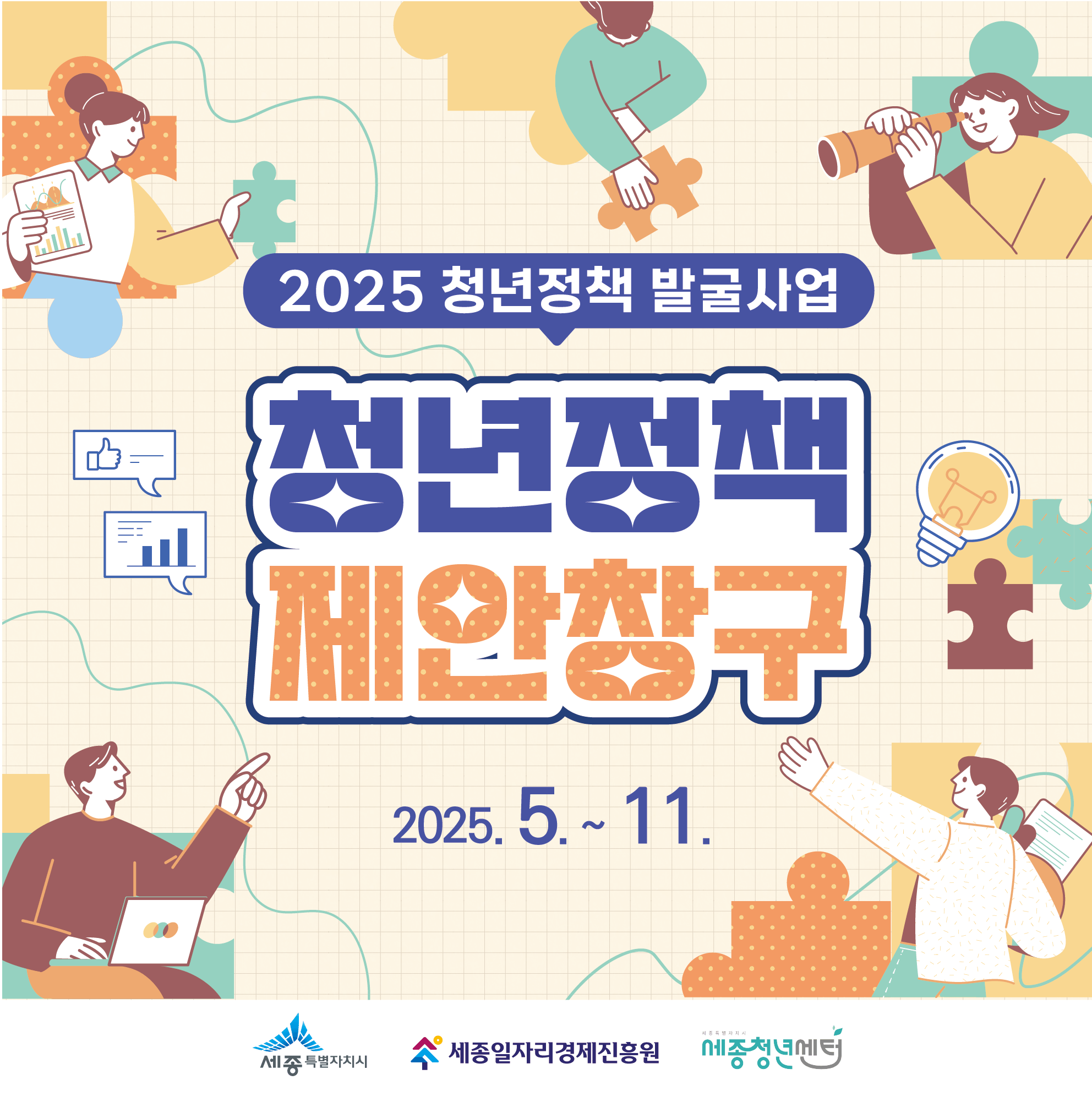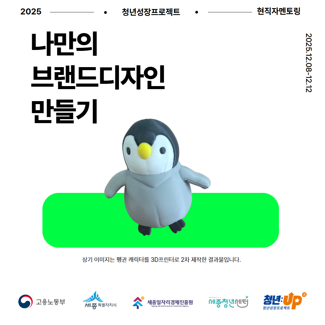 ▶️운영일자: 2025년 12월 8일~12일(5일간) ▶️운영시간: 13:00~17:00(4시간) ▶️운영장소: 세종청년센터 클래스룸 ▶️모집인원: 10명 ▶️모집대상: 만 19~39세 청년 누구나! ▶️안내사항 1. 청년센터 누리집을 통해 참여 신청 2. 자료 다운로드 및 파일 첨부 3. 참여 동기 및 활동 목표 작성 4. 프로그램 확정 후 프로그램 참여하기!